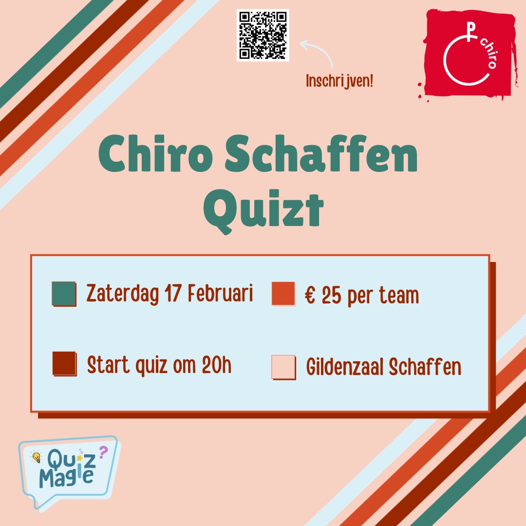 Noteer het in je agenda-> 17 februari is er de fameuze Chiro schaffen quiz in samenwerking met quizmagie😊 Zoals vorig jaar is het €25 per team met Max 5 teamleden. Het is in de Gildenzaal Schaffen te doen. De quiz is weer met pen & papier. Wij zorgen uiteraard voor snacks, drankjes, prijzen en een gezellig sfeer!😁